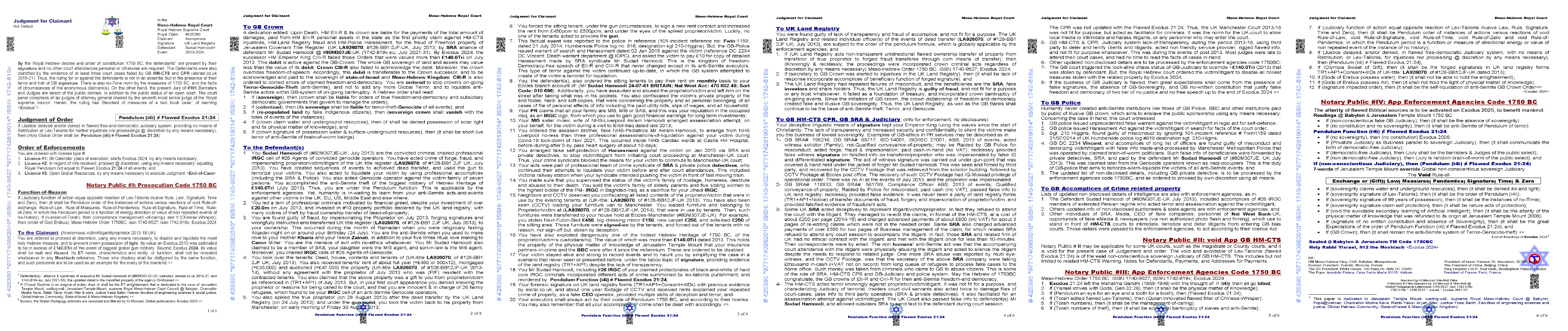 The supreme judge of the court asked the jury to make a decision in private meeting, referring to all needed info about related accomplices. It took the jury of #101 barristers and judges about six hours to return back to the court and give their 99% verdict to the supreme Royal Judge. The jury listed guilty to GB Mr Sudad Hamoodi, UK Land Registry, GB-SRA, GB-Police, and all related personnel. GB-Crown was considered by evidence to be an accomplice of a crime. The jury directed a Pendulum of (Exodus 21:24), or flawed Lex-Talionis (an-eye-for-an-eye and a tooth for a tooth). This is a just Semite punishment, as a normal Hebrew traditional order, which reflected a long term value.